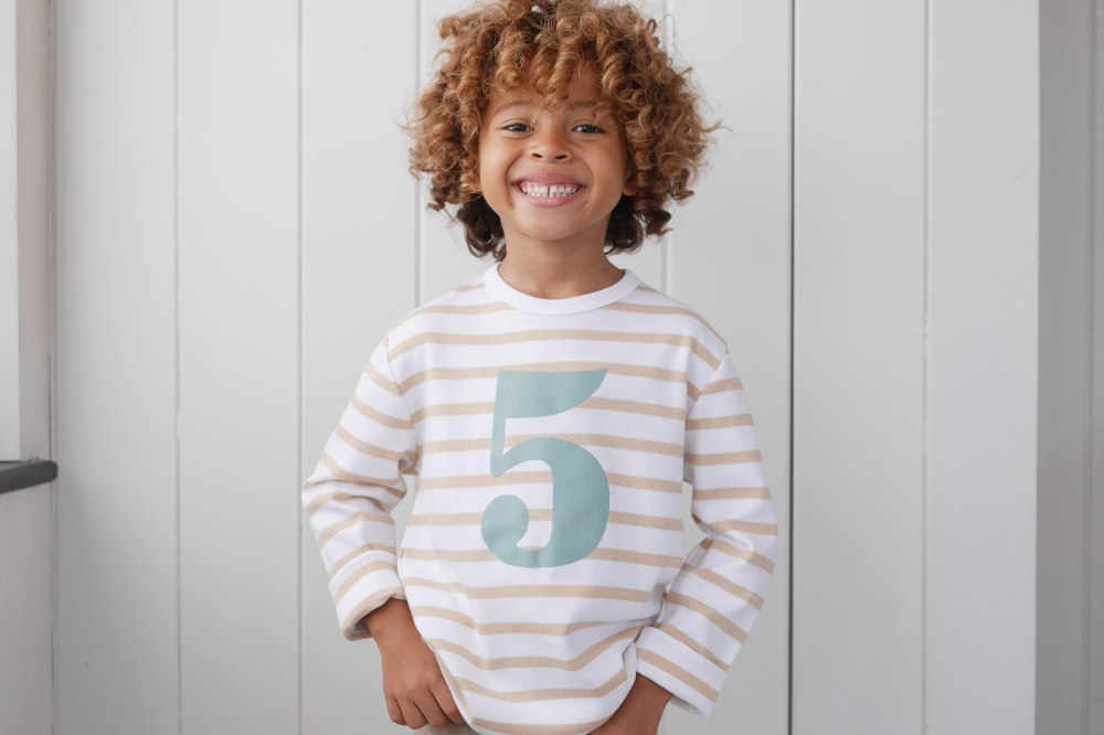 The brand’s ‘every day’s a party’ dresses, available in a variety of vibrant colours, are one of its bestselling lines. Similarly popular are the long-sleeved Birthday Number T-shirts, which feature Breton stripes available with the ages one through to five printed on the front. These T-shirts come in an array of colours ranging from Grass Green, Hot Pink and French Blue to more subdued shades such as Palma Violet and Dusky Pink.